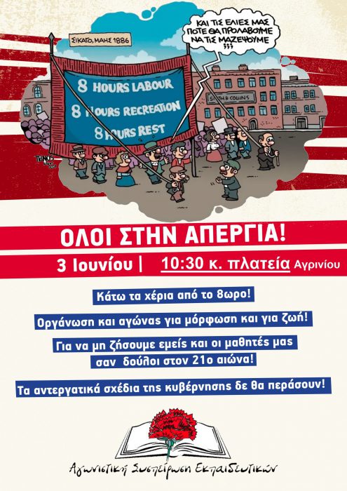 Οι εκπαιδευτικοί, όπως και όλοι οι εργαζόμενοι, έχουμε χρέος να δώσουμε τη μάχη απέναντι στη σύγχρονη σκλαβιά και το βάρβαρο εκμεταλλευτικό σύστημα. Έχουμε χρέος να αποκαλύψουμε στην νέα γενιά, στους μαθητές των ΕΠΑΛ και των Λυκείων, στην αυριανή βάρδια των εργαζομένων, το εφιαλτικό μέλλον που τους ετοιμάζουν κυβέρνηση και εργοδοσία. Μαζί με τους μαθητές μας, με όλους τους εργαζόμενους να μπούμε φραγμός για να μην εφαρμοστούν τα μέτρα που σμπαραλιάζουν τις ζωές μας.