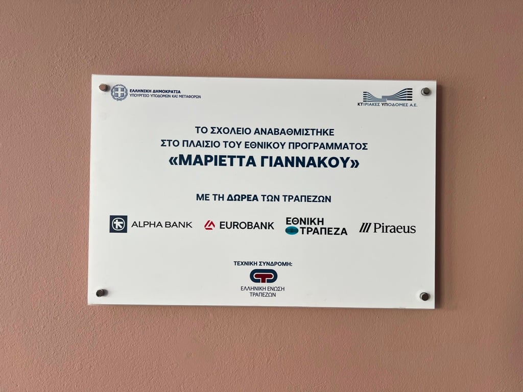 Σ’ όλα τα σχολεία που αναβαθμίστηκαν με το πρόγραμμα «ΜΑΡΙΕΤΤΑ ΓΙΑΝΝΑΚΟΥ», τοποθετήθηκε πλακέτα που αναγράφει ότι πραγματοποιήθηκε με τη «ΔΩΡΕΑ ΤΩΝ ΤΡΑΠΕΖΩΝ» και ακολουθούν οι ονομασίες τους!