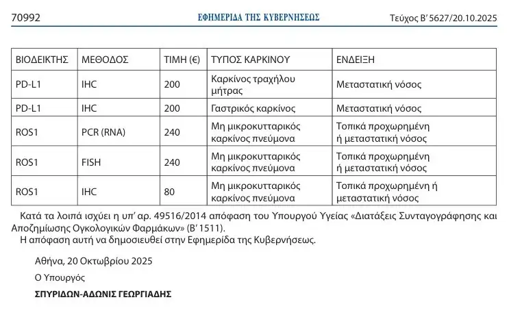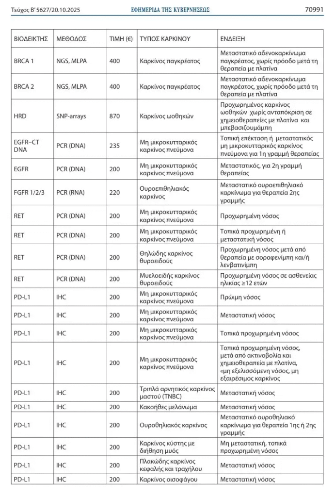 Το ΦΕΚ περιλαμβάνει αναλυτικό πίνακα με τους βιοδείκτες, τη μέθοδο ανάλυσης, την τιμή αποζημίωσης και τη χρήση τους ανά τύπο καρκίνου, καθώς και διαδικαστικά θέματα για τα εργαστήρια και τις εταιρείες που θα συμμετέχουν στο σύστημα.