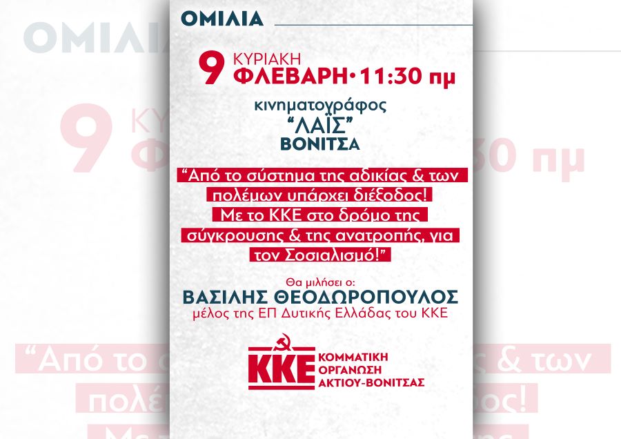 Η Κομματική Οργάνωση Ακτίου-Βόνιτσας του ΚΚΕ, θα πραγματοποιήσει ομιλία με τίτλο: «Από το σύστημα της αδικίας & των πολέμων υπάρχει διέξοδος! Με το ΚΚΕ στο δρόμο της σύγκρουσης & της ανατροπής, για τον Σοσιαλισμό!», την Κυριακή 9 Φλεβάρη, στις 11:30 πμ, στον κινηματογράφο «Λαΐς» στη Βόνιτσα.