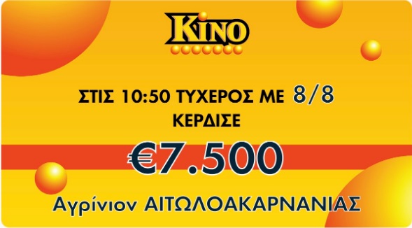 Σε έναν ακόμη Αγρινιώτη χαμογέλασε η τύχη. Ο παίκτης έπαιξε στις 10:50  και έβγαλε 8 στα 8 στο ΚΙΝΟ κερδίζοντας 7.500 ευρώ