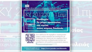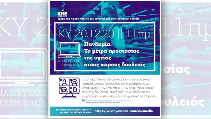 Η 1η εκδήλωση έχει θέμα «Πανδημία: Τα μέτρα προστασίας της υγείας στους χώρους δουλειάς» και την πραγματοποιεί το Τμήμα της ΚΕ του ΚΚΕ για την Εργατική και Συνδικαλιστική Δουλειά, στις 11 π.μ.