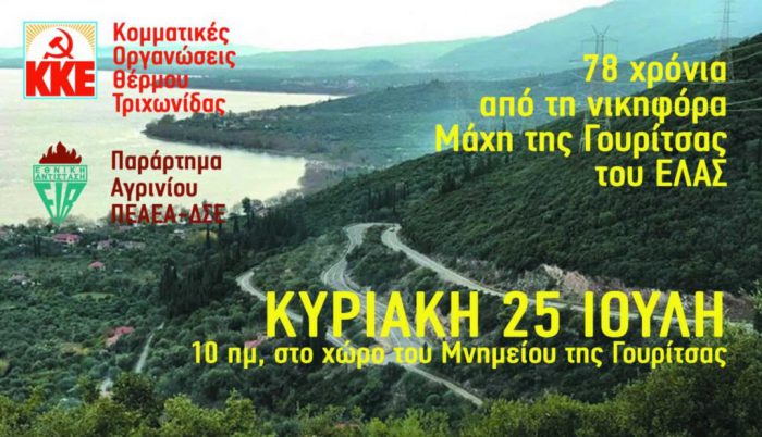 Τα 78 χρόνια από τη νικηφόρα Μάχη της Γουρίτσας του ΕΛΑΣ, τιμούν οι ΚΟ Θέρμου και Τριχωνίδας του ΚΚΕ, μαζί με το Παράρτημα Αγρινίου της ΠΕΑΕ-ΔΣΕ.