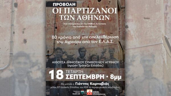 Τιμώντας τα 80 χρόνια από την απελευθέρωση της πόλης του Αγρινίου από τον Ε.Λ.Α.Σ., πραγματοποιούμε εκδήλωση την Τετάρτη 18 Σεπτέμβρη, στις 8μμ, στην αίθουσα του Δημοτικού Συμβουλίου Αγρινίου (πρώην Τράπεζα Ελλάδας). Θα μιλήσει ο Γιάννης Καρναβιάς, μέλος της Επιτροπής Περιοχής Δυτικής Ελλάδας του ΚΚΕ & περιφερειακός σύμβουλος και χαιρετισμός εκ μέρους του Παραρτήματος Αγρινίου της ΠΕΑΕΑ-ΔΣΕ.