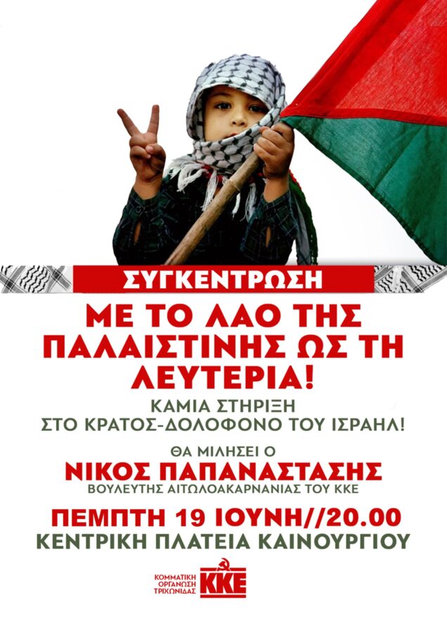 Συγκέντρωση διοργανώνει η Κομματική Οργάνωση Τριχωνίδας, με τίτλο: «Με το λαό της Παλαιστίνης ως τη λευτεριά! Καμία στήριξη στο κράτος-δολοφόνος του Ισραήλ!», την Πέμπτη 19 Ιούνη, στις 8μμ, στην κεντρική πλατεία του Καινούργιου.