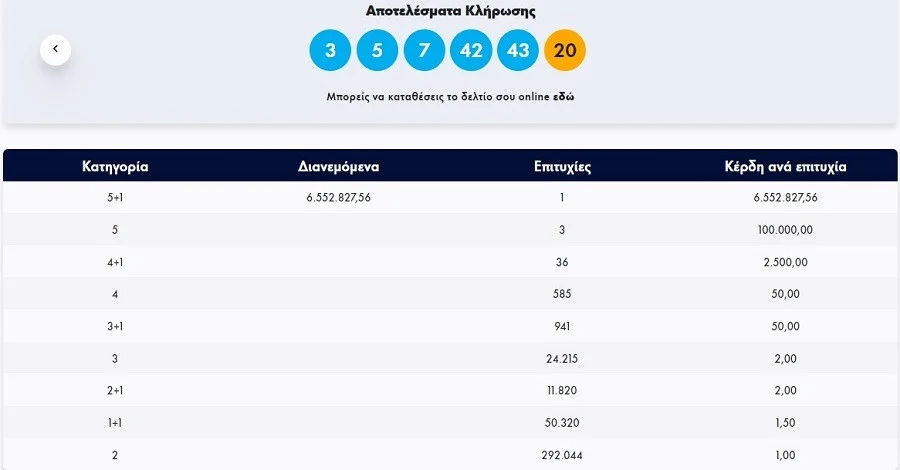Οι αριθμοί που κληρώθηκαν είναι οι 3, 5, 7, 42, 43 και τζόκερ ο 20.