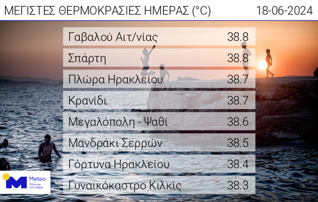 Μικρή άνοδο σημείωσαν οι μέγιστες θερμοκρασίες στη χώρα μας την Τρίτη 18/06. Σύμφωνα με το δίκτυο αυτόματων μετεωρολογικών σταθμών του meteo.gr/Εθνικού Αστεροσκοπείου Αθηνών, η μέγιστη θερμοκρασία σημειώθηκε στη Γαβαλού Αιτωλοακαρνανίας και στη Σπάρτη και ήταν ίση με 38.8 °C. Στον πίνακα που ακολουθεί παρουσιάζονται οι υψηλότερες μέγιστες θερμοκρασίες που καταγράφηκαν έως τις 17:30 της Τρίτης 18/06.