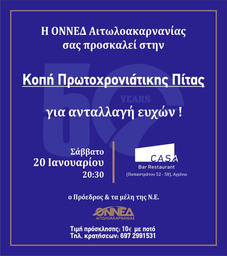 Σας προσκαλούμε στη Κοπή Πρωτοχρονιάτικης πίτας της ΟΝΝΕΔ Αιτωλοακαρνανίας στις 20 Ιανουαρίου και ώρα 20:30 στο Αγρίνιο ,Casa Bar-Restaurant Παπαστράτου 52-58.Η παρουσία σας θα μας τιμήσει ιδιαίτερα.