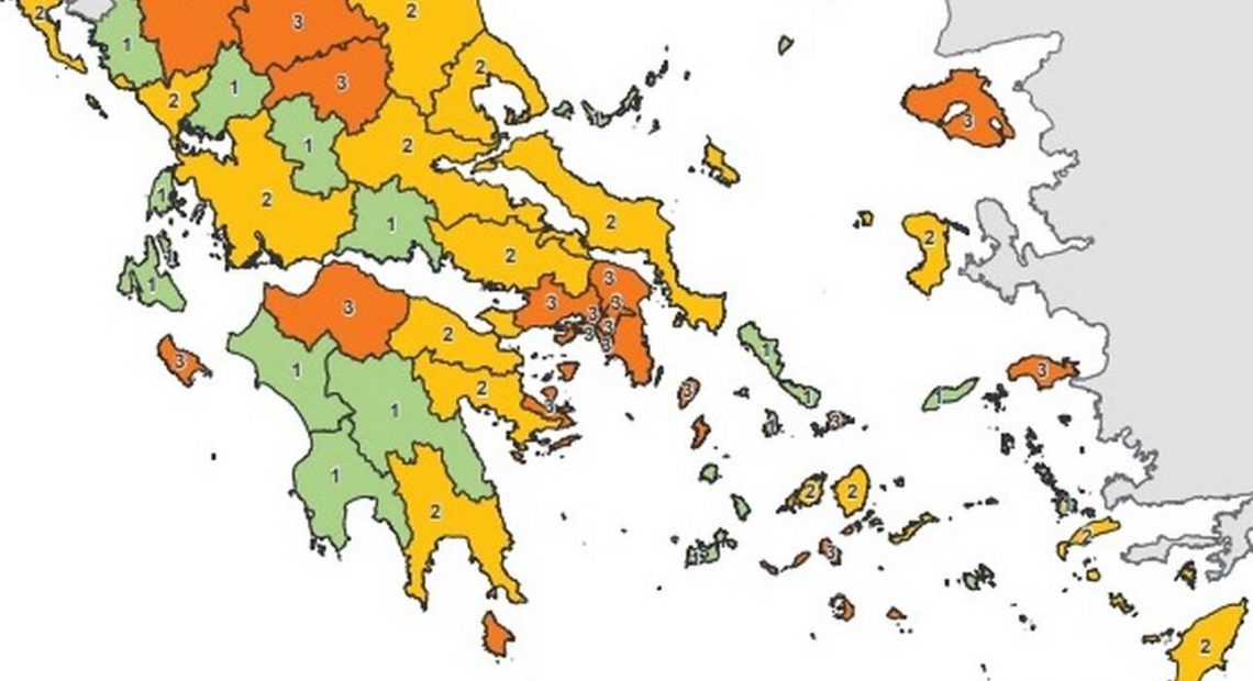 Οι 74 περιοχές της χώρας «χρωματίζονται» ανάλογα με το επίπεδο των κρουσμάτων και της ανάγκης λήψης έκτακτων τοπικών μέτρων.