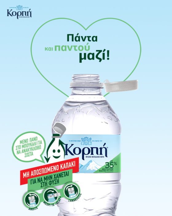Το Φυσικό Μεταλλικό Νερό Κορπή®, κάνει για ακόμη μια φορά πρώτο την αλλαγή στην κατηγορία των φυσικών μεταλλικών νερών στην Ελλάδα, αντικαθιστώντας τα καπάκια με μη αποσπώμενα, σε όλες τις PET συσκευασίες.
