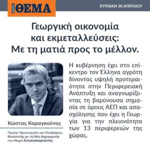 Συνέντευξη με τίτλο «Γεωργική Οικονομία και εκμεταλλεύσεις: Με τη ματιά προς το μέλλον» παραχώρησε ο πρώην Υφυπουργός και υποψήφιος βουλευτής με την Νέα Δημοκρατία στο νομό Αιτωλ/νίας Κώστας Καραγκούνης στην εφημερίδα ΠΡΩΤΟ ΘΕΜΑ την Κυριακή 30 Απριλίου 2023.