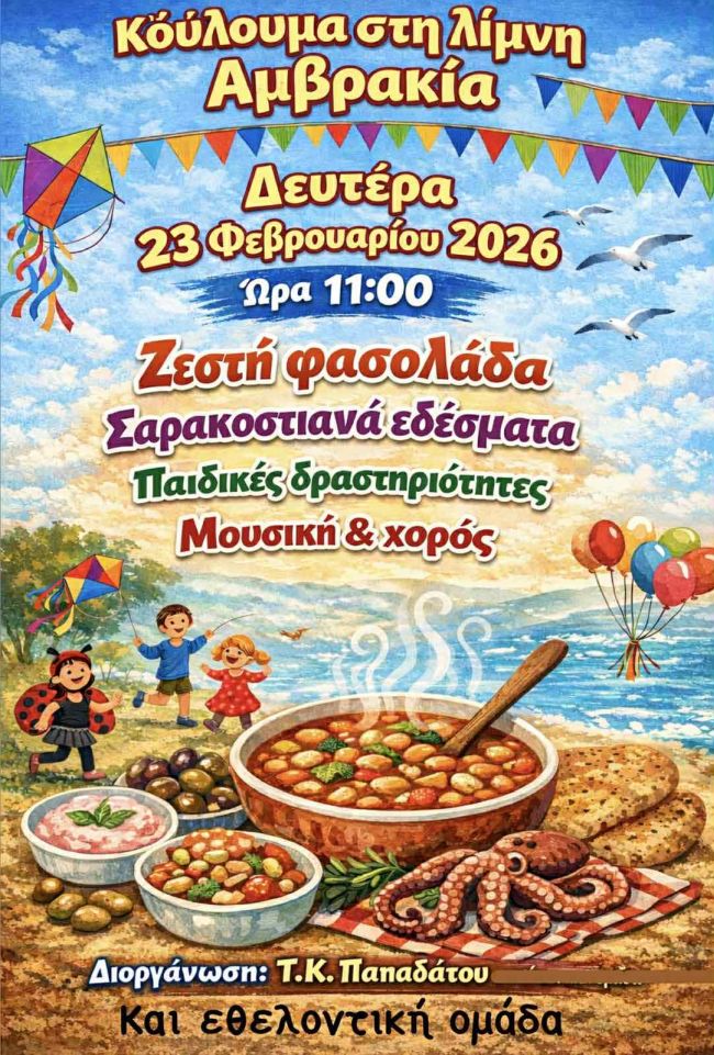 Ο Δήμος Ξηρομέρου καλεί στα Κούλουμα την Καθαρά Δευτέρα 23 Φεβρουαρίου στη λίμνη Αμβρακία, στις 11 το πρωί με ζεστή φασολάδα, Σαρακοστιανά εδέσματα, παιδικές δραστηριότητες, μουσική και χορό.