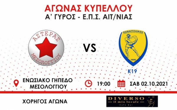 Στην έναρξη της φετινής ποδοσφαιρικής σεζόν ο Αστέρας Μεσολογγίου θα αντιμετωπίσει τον Παναιτωλικό Κ19 για τον Α΄γύρο του Κυπέλλου της Ε.Π.Σ. Αιτωλοακαρνανίας . Ο αγώνας αυτός θα πραγματοποιηθεί το Σάββατο 2 Οκτωβρίου 2021, στις 7:00 μ.μ., στο Ενωσιακό γήπεδο Μεσολογγίου “Θ. Πασσιόπουλος”.