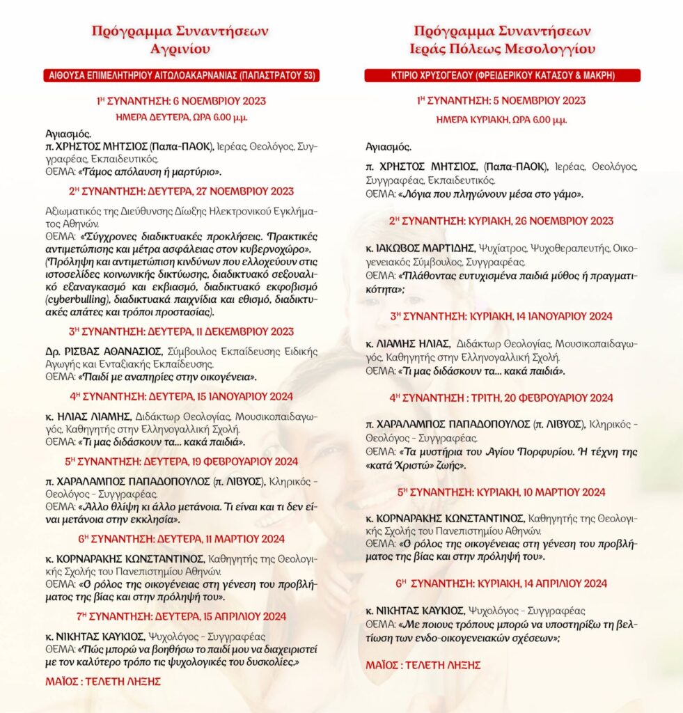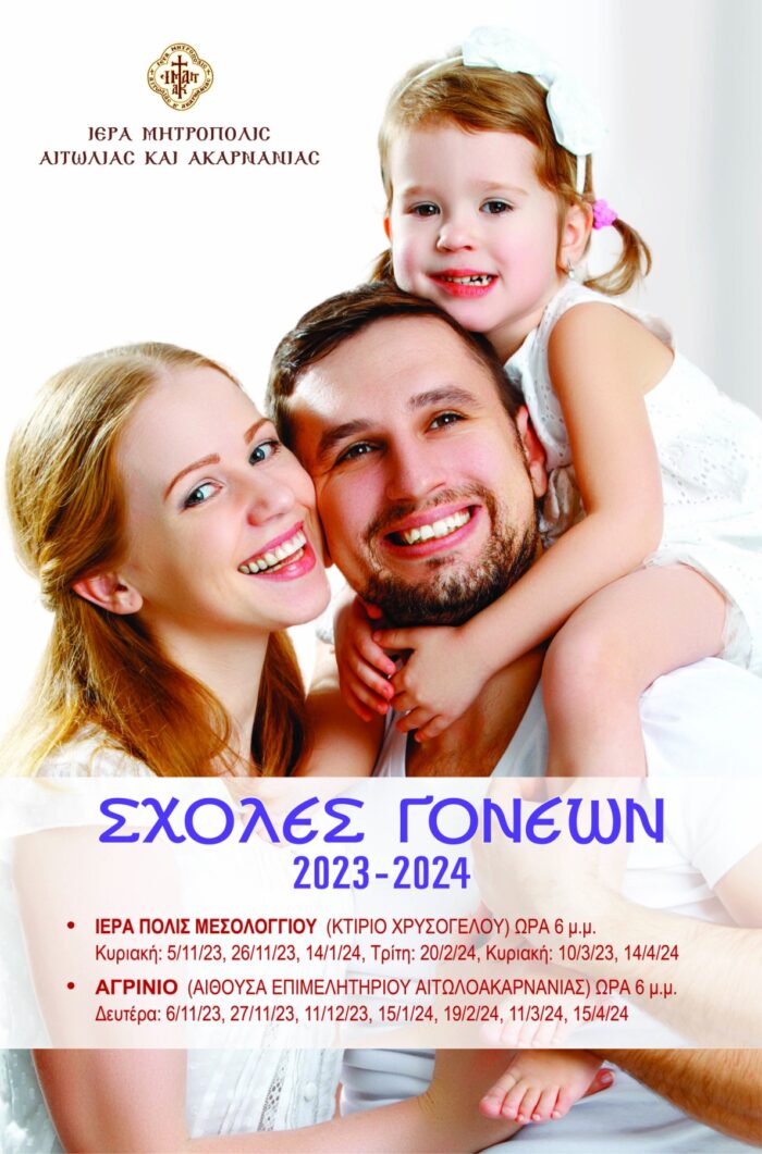 Με γνώμονα και πρωταρχικό σκοπό τη στήριξη του θεσμού της οικογένειας θα λειτουργήσει η Σχολή Γονέων της Ιεράς Μητροπόλεως Αιτωλίας και Ακαρνανίας με αναβαθμισμένο πρόγραμμα και με ομιλίες εκτός από το Μεσολόγγι και το Αγρίνιο και στις έδρες των υπολοίπων Δήμων της Ιεράς Μητροπόλεως, στην Αμφιλοχία, στον Αστακό, στη Βόνιτσα και στο Θέρμο.