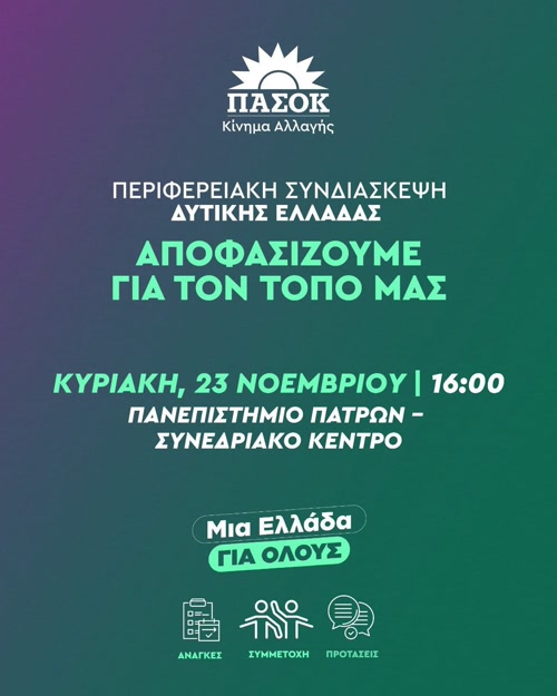 Την Κυριακή 23 Νοεμβρίου 2025 στο Συνεδριακό Κέντρο του Πανεπιστημίου Πατρών, θα λάβει χώρα η Περιφερειακή Συνδιάσκεψη Δυτικής Ελλάδας, η οποία θα ξεκινήσει στις 16.00 και