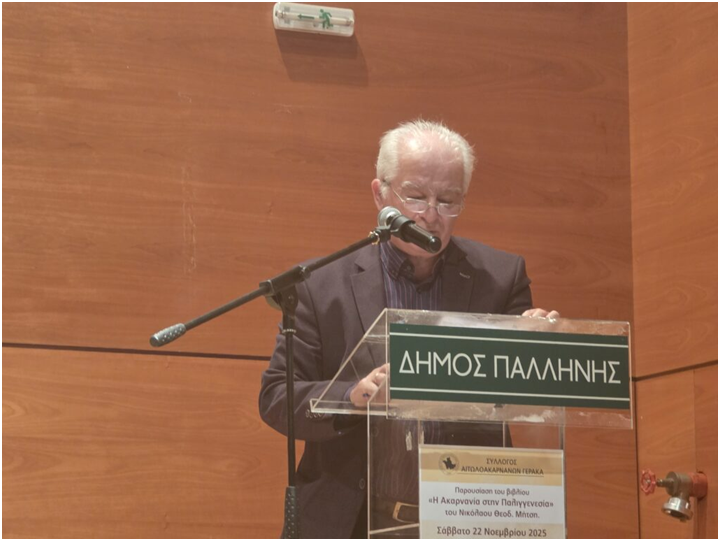 Ο Σύλλογος Αιτωλοακαρνάνων Γέρακα Αττικής, σε συνεργασία με τον Δήμο Παλλήνης, πραγματοποίησε με μεγάλη επιτυχία το Σάββατο 22 Νοεμβρίου 2025, που ξεπέρασε τις προσδοκίες του Δ.Σ, την παρουσίαση του βιβλίου του ιστορικού ερευνητή Νικολάου Θεοδ. Μήτση με τίτλο « Η Ακαρνανία στην Παλιγγενεσία » .