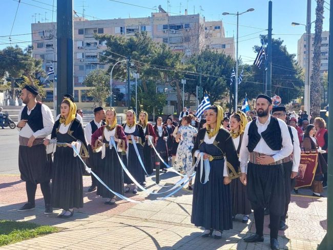 Μετά τηνΔοξολογία στον Μητροπολιτικό Ιερό Ναό Ευαγγελιστρίας Περιστερίου και την εκφώνηση του πανηγυρικού της ημέρας από τον Φώτη Σπυρόπουλο, ακολούθησε πομπή με τη Φιλαρμονική, συλλόγων και τμημάτων με παραδοσιακές φορεσιές, τους επισήμους και το πλήθος του κόσμου, στο άγαλμα του Κωστή Παλαμά, όπου έγιναν και οι καταθέσεις στεφάνων.