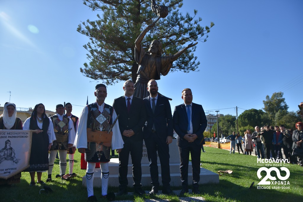 Τα αποκαλυπτήρια του ανδριάντα πραγματοποιήθηκαν από τον Σεβασμιώτατο Μητροπολίτη Αιτωλίας και Ακαρνανίας κ.κ. Δαμασκηνό, τον Περιφερειάρχη Δυτικής Ελλάδας, κ. Νεκτάριο Φαρμάκη, τον Δήμαρχο Ιεράς Πόλεως Μεσολογγίου, κ. Σπυρίδων Διαμαντόπουλο και τον γλύπτη Ευάγγελο Τύμπα, παρουσία του Αντιπεριφερειάρχη Αιτωλοακαρνανίας, κ. Θανάση Μαυρομμάτη.