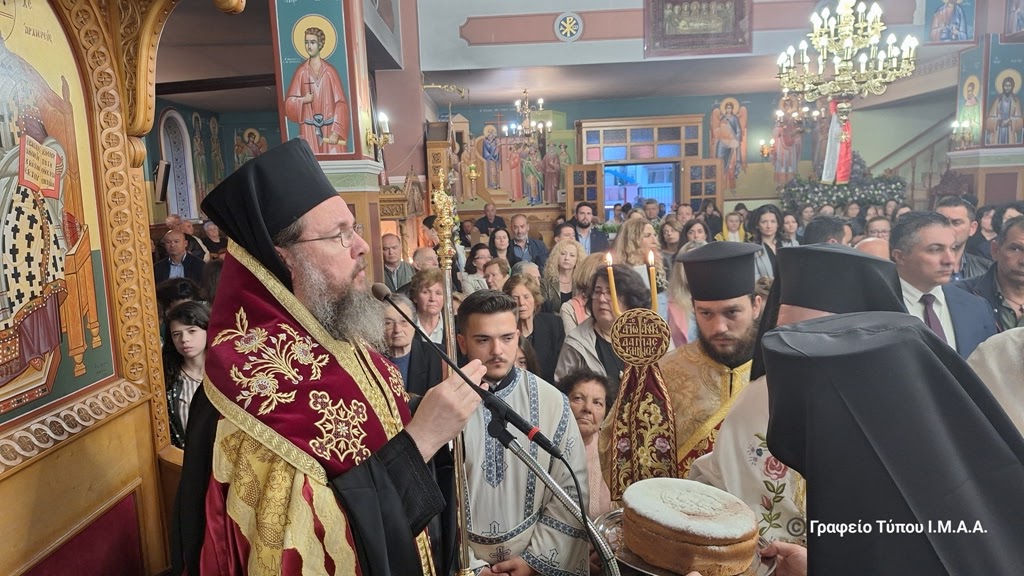Ο Σεβασμιώτατος επιδίδοντας την τιμητική πλακέτα στον συνταξιούχο Εφημέριο, π. Απόστολο, τον ευχαρίστησε για το έργο του και την προσφορά του στην Ενορία, λέγοντας ότι «φέρει στους ώμους του μια πολυετή εμπειρία ιερατικής διακονίας. Ένας ιερέας και ένας εφημέριος μιας Ενορίας δεν είναι μόνο ο Λειτουργός των Μυστηρίων. Είναι ο πνευματικός, ο σύμβουλος, το ορατό σημείο της ενότητος μιας Ενορίας, εκείνος που πρώτος απ’ όλους μετέχει στις χαρές και στις λύπες των ανθρώπων. Έτσι, λοιπόν, ο π. Απόστολος αποτελεί μια ζωντανή ιστορία. Η Εκκλησία είναι μία μακρά αλυσίδα. Δεν είναι κάτι προσωποπαγές. Ούτε το Θυσιαστήριο, ούτε ο Επισκοπικός θρόνος, ούτε το Αναλόγιο μας ανήκει. Ερχόμαστε και φεύγουμε. Γινόμαστε όλοι ένας κρίκος αυτής της αλυσίδας. Και ο π. Απόστολος είδε το έργο του να συνεχίζεται και να αυξάνεται».