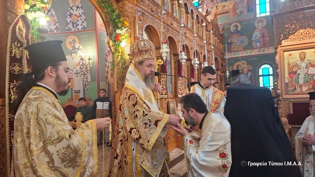 Ο Σεβασμιώτατος απένειμε το οφφίκιο του Πρωτοπρεσβυτέρου στον π. Αναστάσιο Αυγέρη, Εφημέριο του Ιερού Ναού, ευχόμενος να συνεχίσει την διακονία του με σύνεση και υπακοή στην Εκκλησία και στον Επίσκοπό του και να του υπενθυμίζει ο Τίμιος Σταυρός, ότι η ιερατική ζωή είναι κένωση και θυσία υπέρ των αδελφών μας.