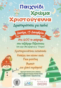 Κατά τη διάρκεια της εκδήλωσης, οι μικροί μας φίλοι είχαν την ευκαιρία να απολαύσουν μια σειρά από δημιουργικές και ψυχαγωγικές δραστηριότητες, τις οποίες επιμελήθηκαν οι σπουδάστριες του Γ’ εξαμήνου της ειδικότητας Βοηθός Παιδαγωγών Πρώιμης Παιδικής Ηλικίας. Μεταξύ αυτών περιλαμβάνονταν χριστουγεννιάτικες κατασκευές και ζωγραφιές, κούκλες που έκαναν ευχές, face painting και εμφάνιση μασκότ.