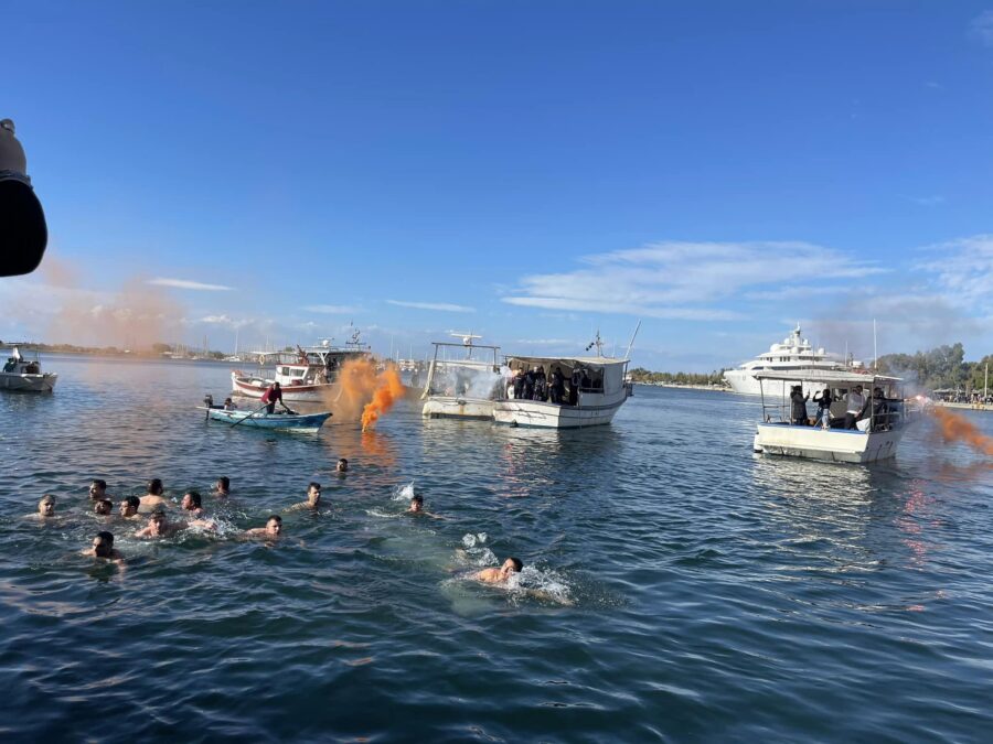 Αμέσως μετά τη Θεία Λειτουργία ο Σεβασμιώτατος τέλεσε την Ακολουθία του Μεγάλου Αγιασμού εντός του Ναού και στη συνέχεια, με λιτανευτική πομπή, άπαντες κατευθύνθηκαν στο Λιμάνι της Ιεράς Πόλεως, όπου πραγματοποιήθηκε η Τελετή Κατάδυσης του Τιμίου Σταυρού και ο Αγιασμός των Υδάτων.