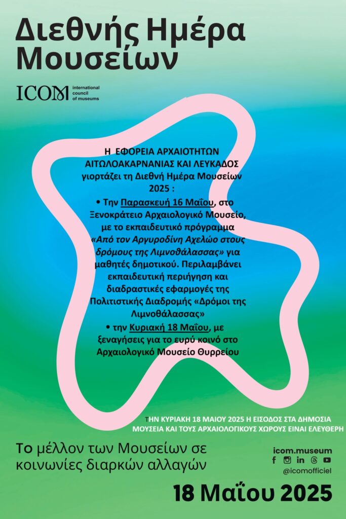 Η Εφορεία Αρχαιοτήτων Αιτωλοακαρνανίας και Λευκάδος, μετά από πρόσκληση του Ελληνικού Τμήματος ICOM, συμμετέχει και φέτος στον εορτασμό για την Διεθνή Ημέρα Μουσείων 2025, με θέμα «Μουσεία και κοινωνίες σε διαρκή αλλαγή».