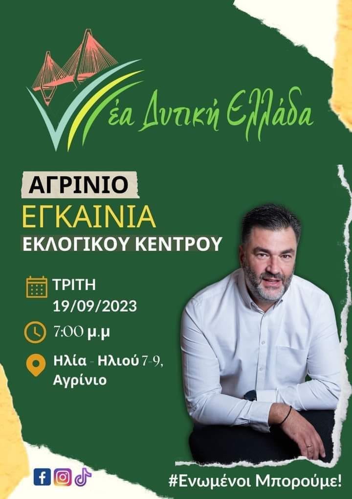 Με την παρουσία του Γραμματέα του ΠΑΣΟΚ -Κίνημα Αλλαγής Ανδρέα Σπυρόπουλου, θα εγκαινιαστεί το εκλογικό κέντρο του Υποψηφίου Περιφερειάρχη Δυτικής Ελλάδος Σπύρου Σκιαδαρέση στο Αγρίνιο (Ηλία Ηλιού 7-9) την Τρίτη 19 Σεπτεμβρίου 2023 και ώρα 19:00 μμ.