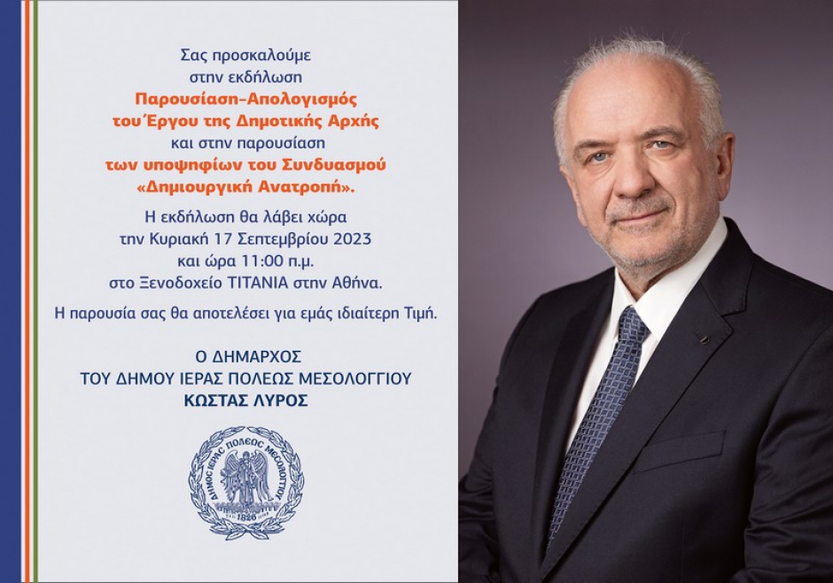 Ο Δήμαρχος του Δήμου της Ιερής  Πόλης  του Μεσολογγίου, Κώστας Λύρος  θα παρουσιάσει το έργο της Δημοτικής Αρχής καθώς  επίσης και  το όραμά του, μια πρόταση ανάπτυξης, προοπτικής και  αισιοδοξίας ,  για την επόμενη ημέρα  σε  εκδήλωση που  θα λάβει χώρα την  Κυριακή 17 Σεπτεμβρίου 2023 και ώρα 11:00 π.μ. στο ξενοδοχείο «Τιτάνια» στην Αθήνα.
