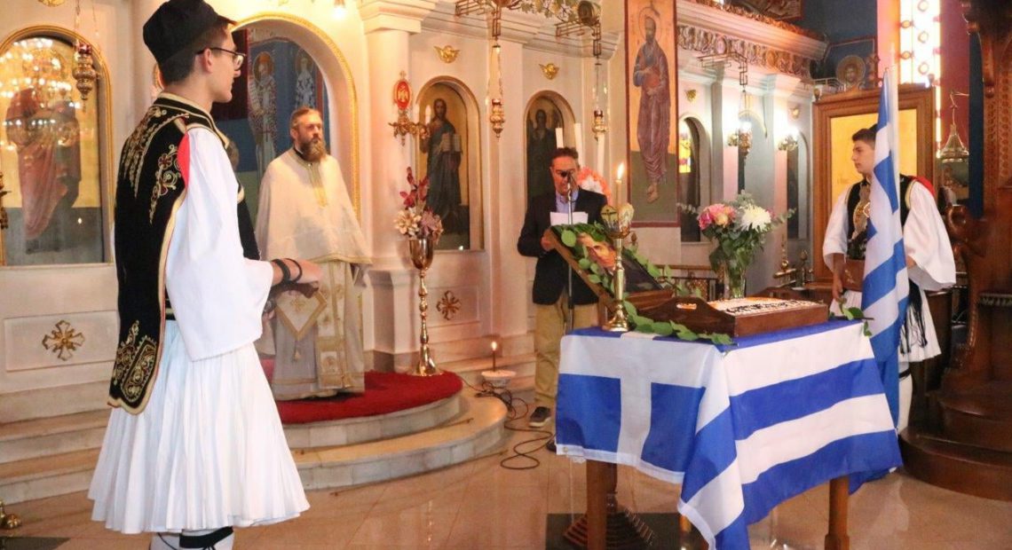 Παραστάτες δεξιά και αριστερά του δίσκου του μνημόσυνου, κρατώντας την Ελληνική Σημαία ήταν τα δυο νεαρά παλληκάρια του συλλόγου ο Αλέξανδρος Κατσιούλης και ο Νεκτάριος Σταθόπουλος, ντυμένοι με την πατροπαράδοτη Ελληνική φορεσιά.