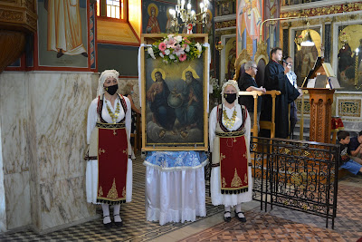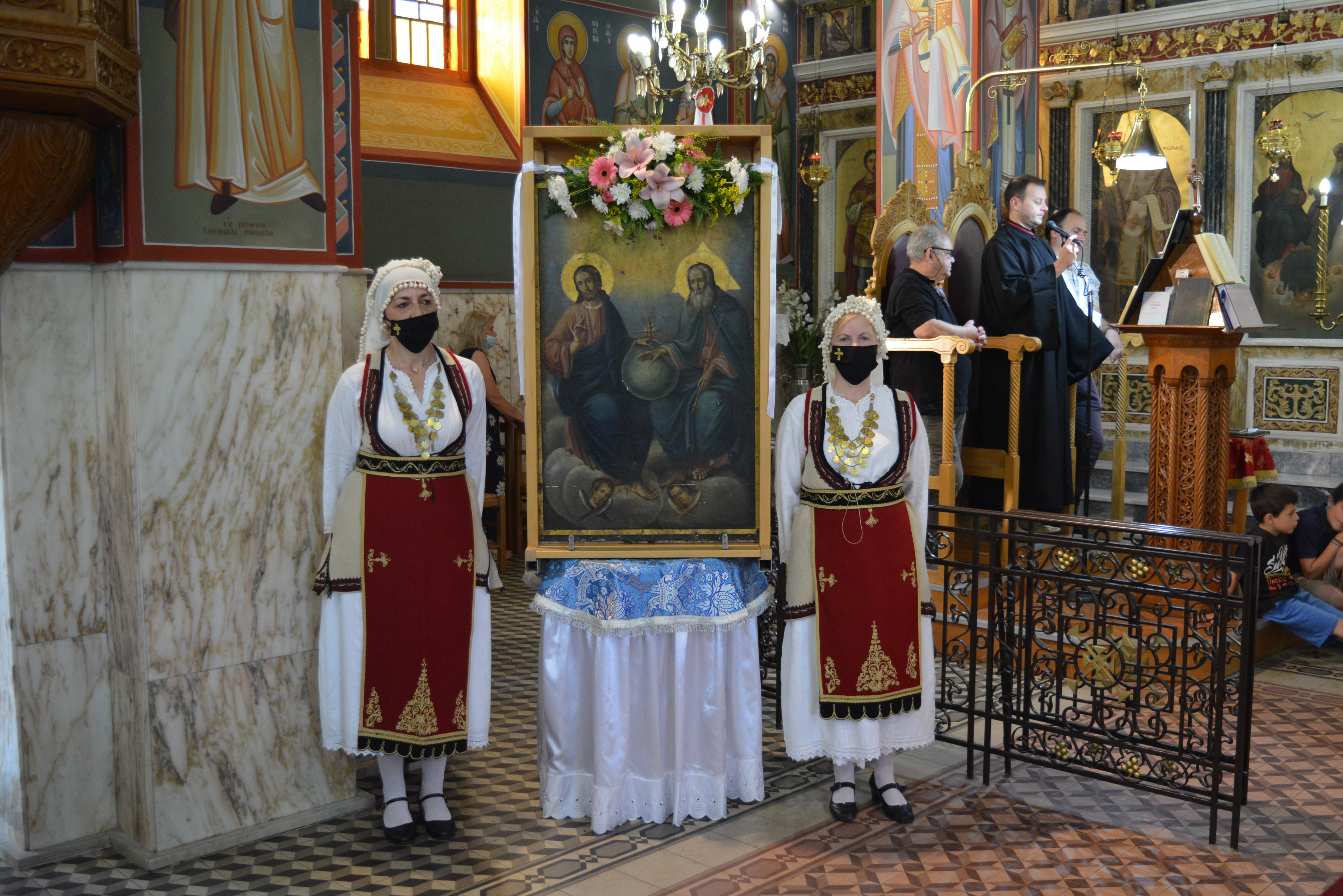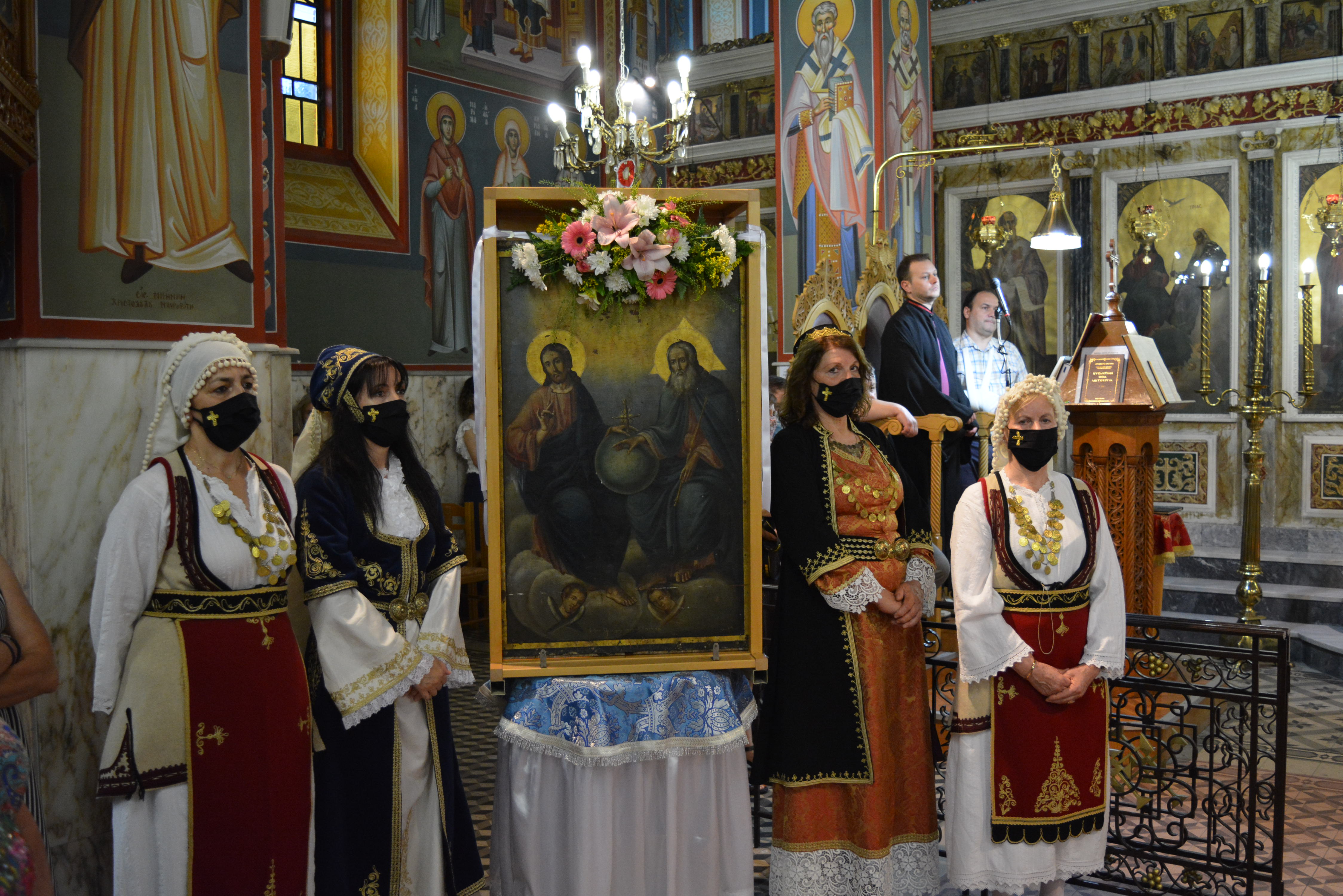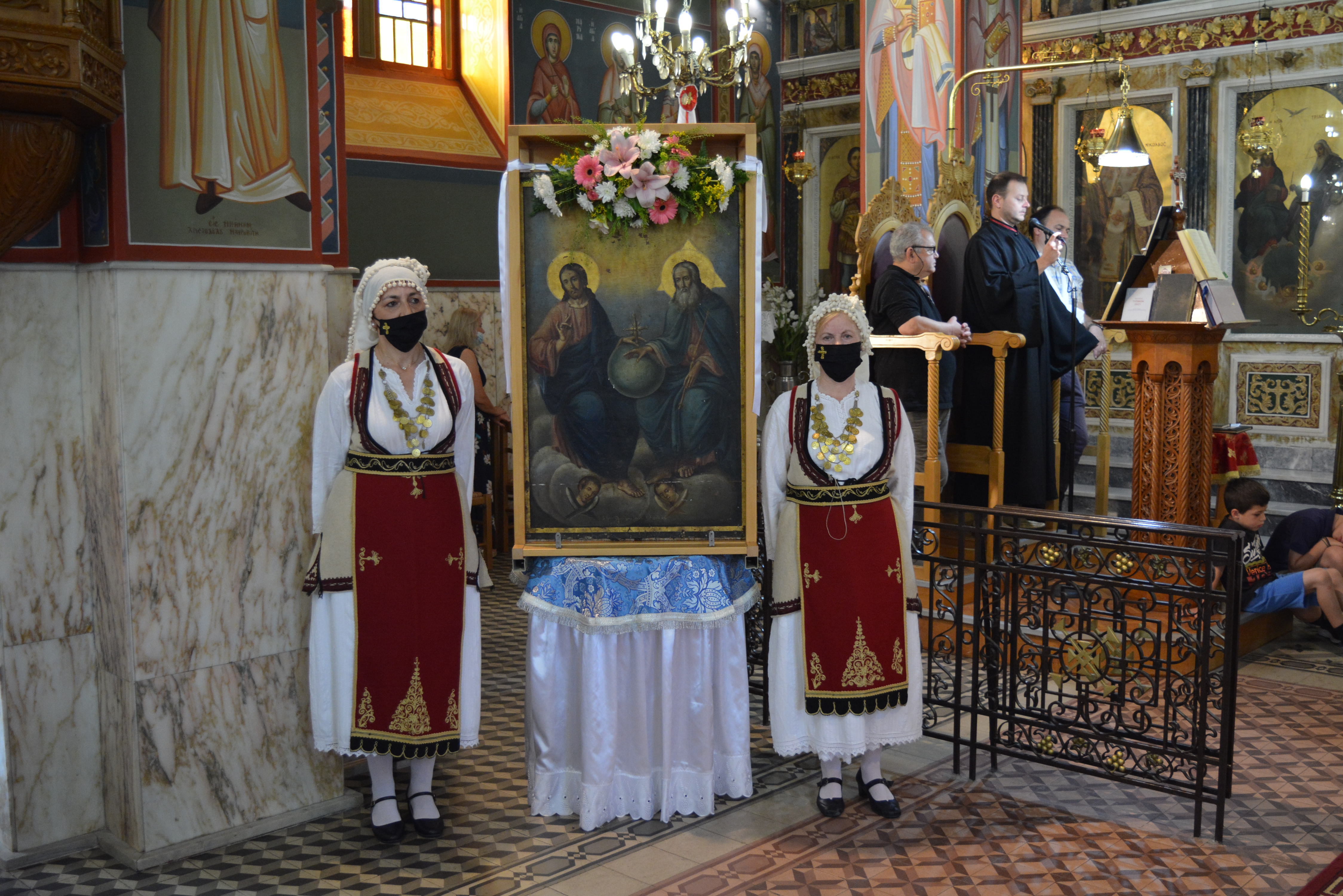 Κυρίες μέλη του Πολιτιστικού Συλλόγου Παναιτωλίου “Χρήστος Καπράλος” κατά την διάρκεια της τέλεσης του Εσπερινού πλαισίωναν την ιερή εικόνα της Αγίας Τριάδος που χρονολογείται από το 1844 και για πρώτη φορά εκτέθηκε για προσκύνηση.