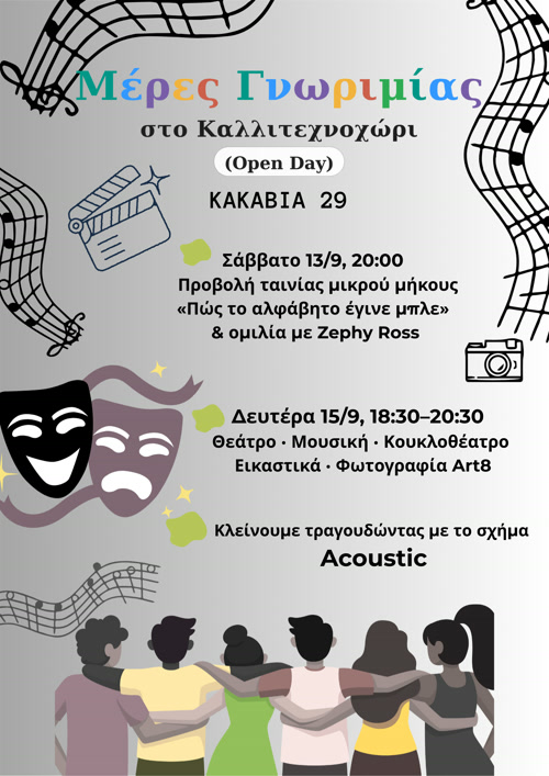 Το Καλλιτεχνοχώρι ανοίγει τις πόρτες του για μια ζεστή συνάντηση, όπου μικροί και μεγάλοι γίνονται παρέα. Ελάτε να γνωριστούμε από κοντά — μέσα από το χρώμα, τη μουσική, το θέατρο, το παιχνίδι και τη φωτογραφία.