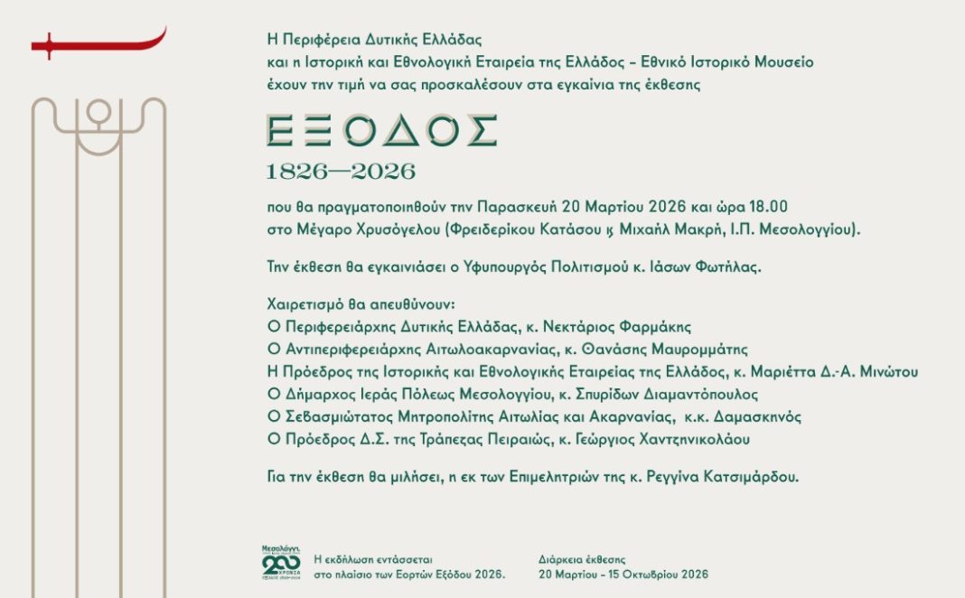 προσκαλούν στα εγκαίνια της έκθεσης «ΕΞΟΔΟΣ 1826 – 2026» που θα πραγματοποιηθούν την Παρασκευή 20 Μαρτίου 2026 και ώρα 18:00 στο Μέγαρο Χρυσόγελου (Φρειδερίκου Κατάσου & Μιχαήλ Μακρή, Ι.Π. Μεσολογγίου).