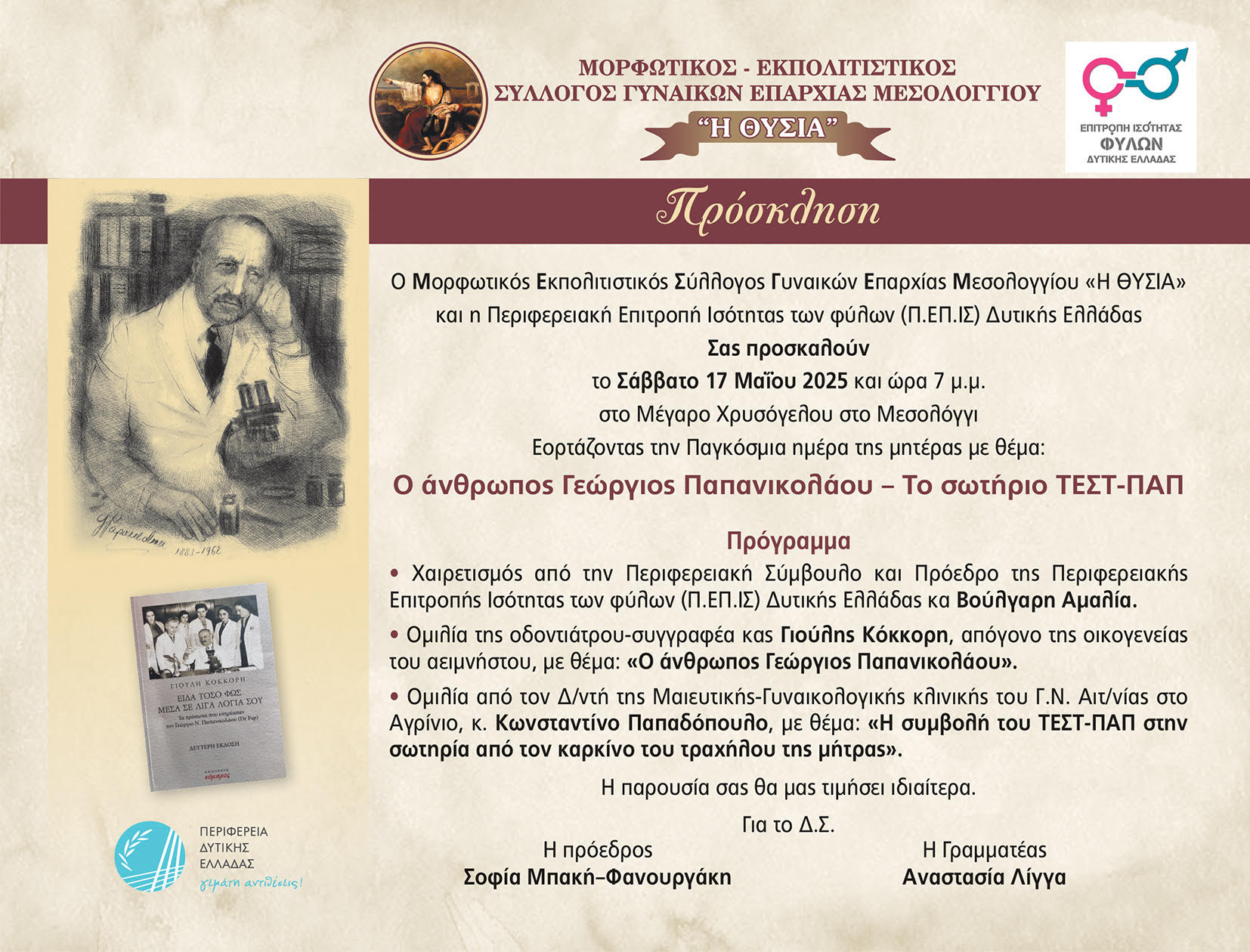 Ο Μορφωτικός Εκπολιτιστικός Σύλλογος Γυναικών Επαρχίας Μεσολογγίου «Η ΘΥΣΙΑ» και η Περιφερειακή Επιτροπή Ισότητας των φύλων(Π.ΕΠ.ΙΣ) Δυτικής Ελλάδας