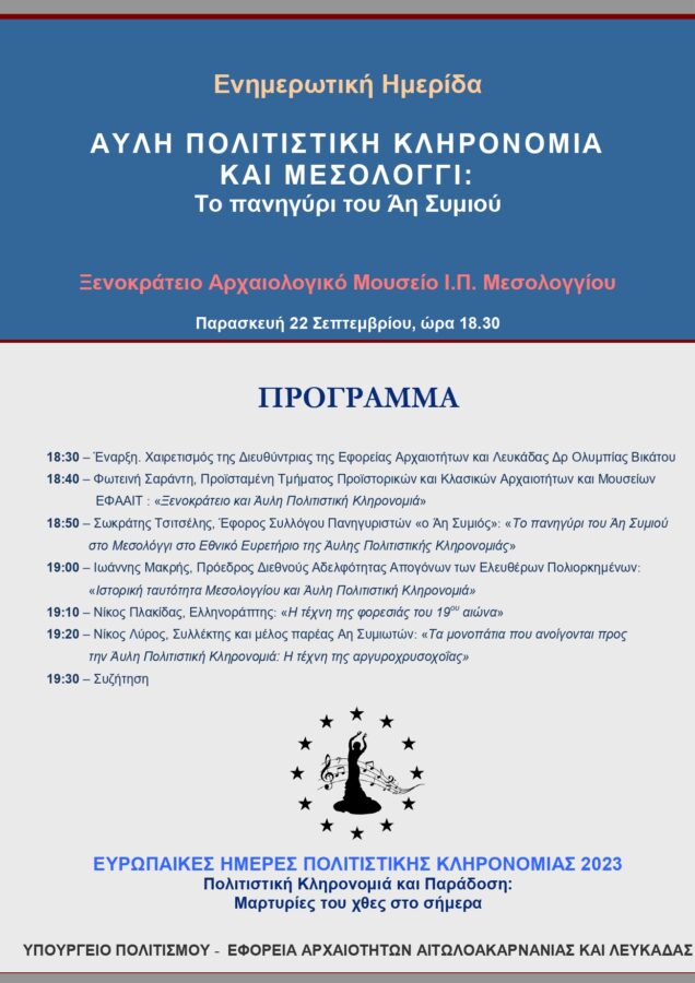 στο πλαίσιο εορτασμού των Ευρωπαϊκών Ημερών Πολιτιστικής Κληρονομιάς 2023, με κεντρικό θέμα «Πολιτιστική Κληρονομιά και Παράδοση: Μαρτυρίες του χθες στο σήμερα».