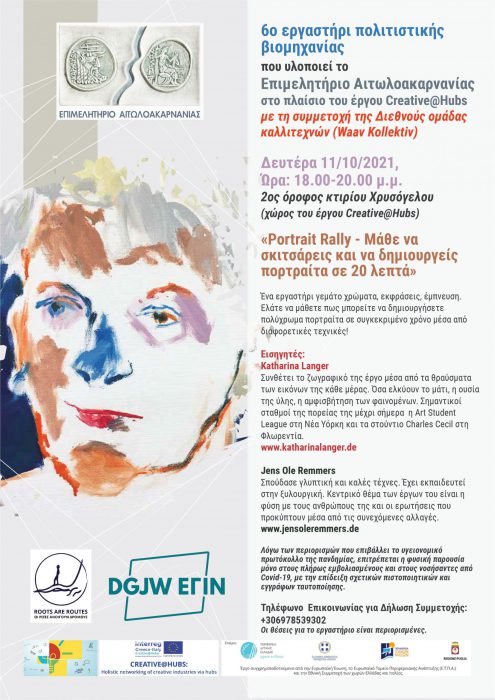 Την Δευτέρα 11 Οκτωβρίου 2021, 6 με 8 το απόγευμα,  στο κτίριο Χρυσόγελου (2ος όροφος) στο Μεσολόγγι, θα πραγματοποιηθεί το εργαστήριο “Portrait Rally: Μάθε να σκιτσάρεις και να δημιουργείς πορτραίτα σε 20 λεπτά”.