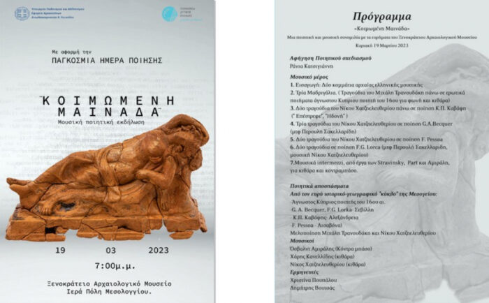 Ο Περιφερειάρχης Δυτικής Ελλάδας κ. Νεκτάριος Φαρμάκης, ο Αντιπεριφερειάρχης Πολιτισμού και Τουρισμού κ. Νικόλαος Κοροβέσης και η Διευθύντρια του Ξενοκράτειου Αρχαιολογικού Μουσείου , Δρ Ολυμπία Βικάτου σας προσκαλούν με αφορμή την Παγκόσμια Ημέρα Ποίησης στην πολιτιστική εκδήλωση με τίτλο «Κοιμωμένη μαινάδα», μια ποιητική και μουσική συνομιλία με τα ευρήματα του Ξενοκράτειου Αρχαιολογικού Μουσείου, την Κυριακή στις 19 Μαρτίου του 2023 και ώρα 7.00 μ.μ το απόγευμα στον χώρο του Ξενοκράτειου Αρχαιολογικού Μουσείου της Ι.Π Μεσολογγίου.