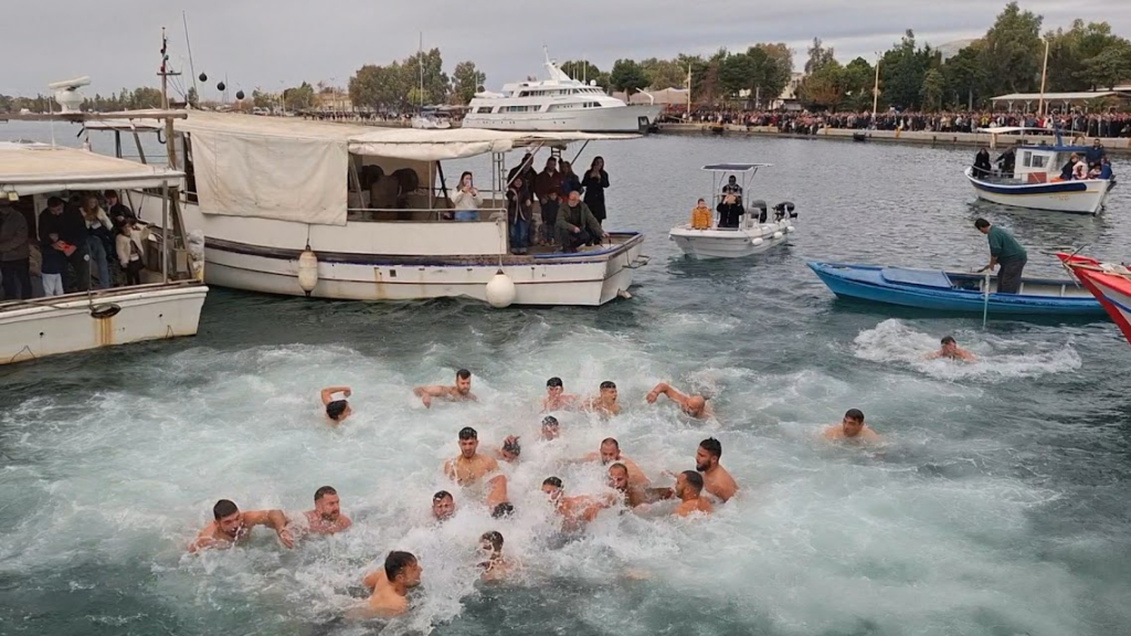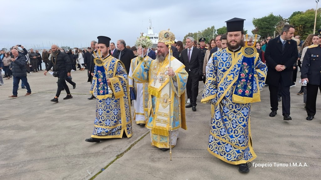 Αμέσως μετά τη Θεία Λειτουργία, ο Σεβασμιώτατος τέλεσε την Ακολουθία του Μεγάλου Αγιασμού εντός του Ναού και στη συνέχεια, με λιτανευτική πομπή, άπαντες κατευθύνθηκαν στο Λιμάνι της Ιεράς Πόλεως, όπου πραγματοποιήθηκε η Τελετή Κατάδυσης του Τιμίου Σταυρού και ο Αγιασμός των Υδάτων.