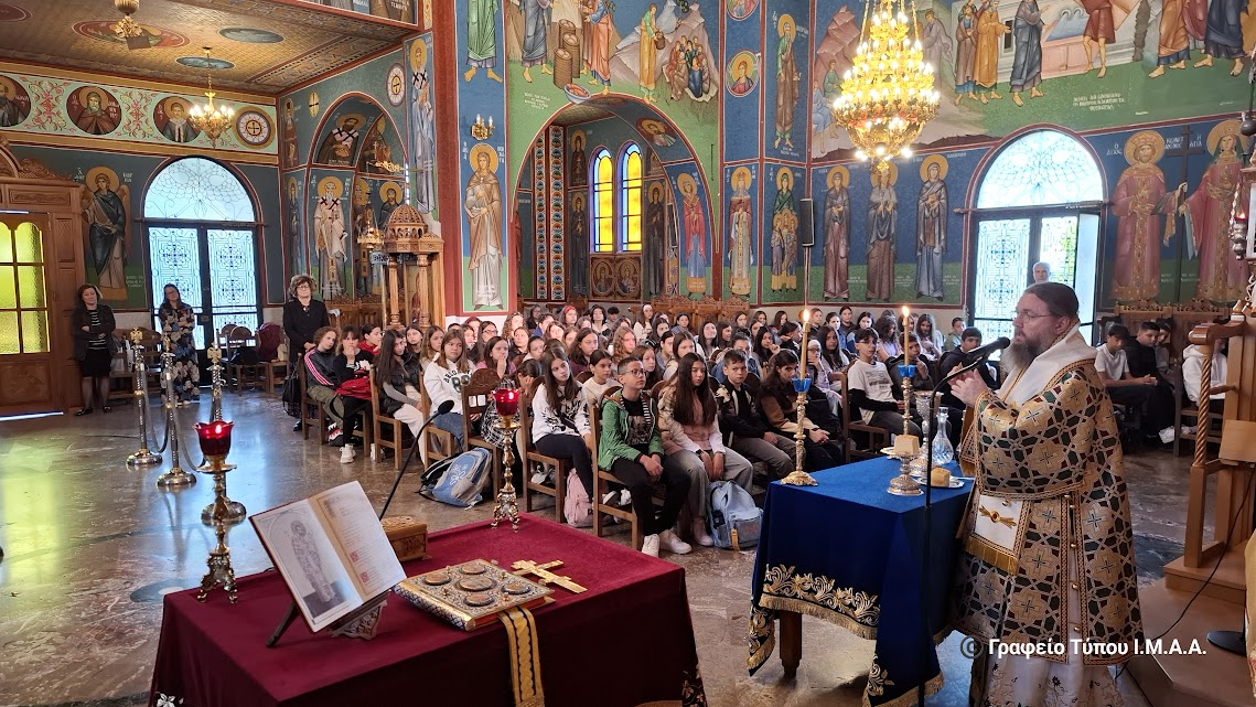 Μιλώντας στους μαθητές και στις μαθήτριες τόνισε, ότι ο Χριστός είναι το Α και το Ω της ζωής μας. Σε Εκείνον οφείλουμε τα πάντα ! Ολόκληρη η ζωή μας πρέπει να είναι αφιερωμένη στο θέλημά Του. Η αγάπη μας προς Εκείνον πρέπει να εκφράζεται με την προσευχή μας, αλλά και με την αγάπη μας προς τους συνανθρώπους μας.