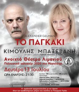 Στο πλαίσιο των εκδηλώσεων «Πολιτιστικό Καλοκαίρι 2020» που διοργανώνει το Πνευματικό Κέντρο του Δήμου Ι.Π. Μεσολογγίου, την Δευτέρα 13 Ιουλίου και ώρα 21.30, ο Γιώργος Κιμούλης και η Φωτεινή Μπαξεβάνη θα παρουσιάσουν την θεατρική παράσταση «Το παγκάκι» του Alexander Gelman, στο Ανοικτό Θέατρο Λιμανιού.