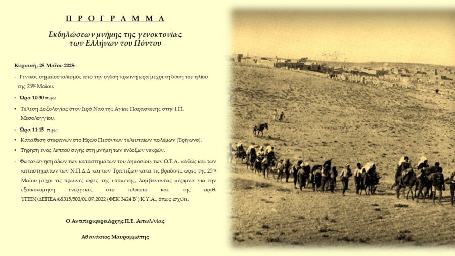 εκδηλώσεις θα πραγματοποιηθούν στην Ι.Π. Μεσολογγίου την 25η Μαΐου 2025, ημέρα Κυριακή.