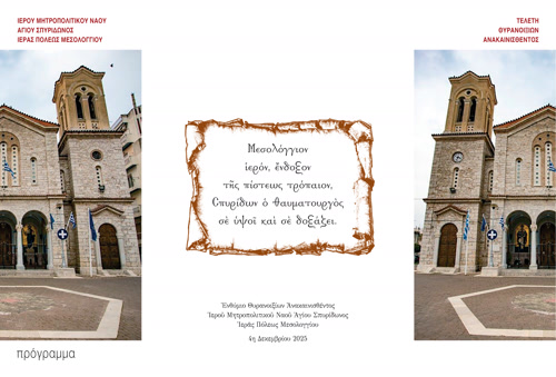 Στις 4 Δεκεμβρίου θα πραγματοποιηθούν τα θυρανοίξια του Ιερού Μητροπολιτικού Ναού του Αγίου Σπυρίδωνος στο Μεσολόγγι.