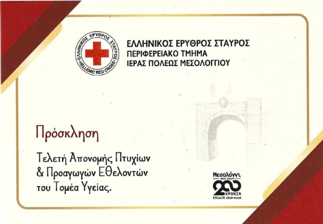 Τελετή απονομής πτυχίων και προαγωγών εθελοντών του Τομέα Υγείας διοργανώνει το Περιφερειακό Τμήμα Ιεράς Πόλεως Μεσολογγίου του Ελληνικού Ερυθρού Σταυρού, το Σάββατο 31 Ιανουαρίου 2026 και ώρα 18:00.