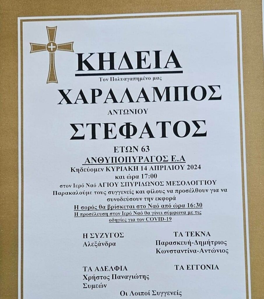 Έφυγε από την ζωή ο Ανθυποπυραγος Ε.Α Χαράλαμπος Στεφάτος σε ηλικία 63 χρόνων σκορπώντας θλίψη στο Μεσολόγγι και την ευρύτερη περιοχή.