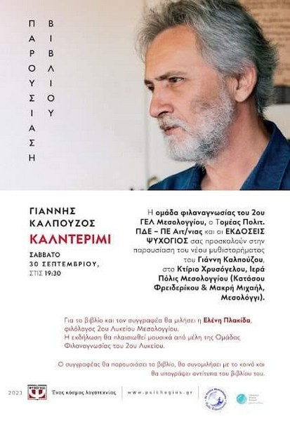 Ο Τομέας Πολιτισμού της ΠΔΕ σε συνδιοργάνωση με την ομάδα φιλαναγνωσίας του 2ου ΓΕΛ Μεσολογγίου και τις ΕΚΔΟΣΕΙΣ ΨΥΧΟΓΙΟΣ σας προσκαλούν στην παρουσίαση του νέου μυθιστορήματος του ΓΙΑΝΝΗ ΚΑΛΠΟΥΖΟΥ με τίτλο «Καλντερίμι» που θα πραγματοποιηθεί το Σαββάτο 30 Σεπτεμβρίου 2023 και ώρα 19.30, στο Κτίριο Χρυσόγελου. Μία εκδήλωση με κεντρική ομιλήτρια τη φιλόλογο κ. Ελένη Πλακίδα που θα πλαισιωθεί μουσικά από μέλη της Ομάδας Φιλαναγνωσίας του 2ου Λυκείου της Ι.Π. Μεσολογγίου.