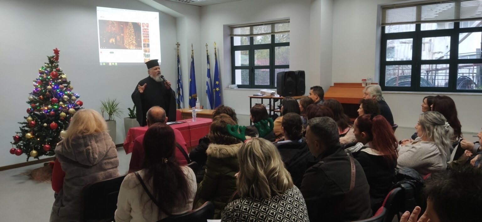 Ο πατέρας Δημήτριος Πατσιαλός, Θεολόγος, εφημέριος του Ιερού Ναού Αγίου Δημητρίου Νεάπολης Αγρινίου, με τα χαράς ανταποκρίθηκε στη πρόσκληση των εκπαιδευτικών και των εκπαιδευομένων του σχολείου και μέσα από την εισήγησή του με απλό ανθρώπινο και κατανοητό λόγο, μίλησε στην καρδιά και τη ψυχή όλων για τη μεγάλη γιορτή της Χριστιανοσύνης, τη γέννηση του Χριστού και το πνεύμα των Χριστουγέννων.