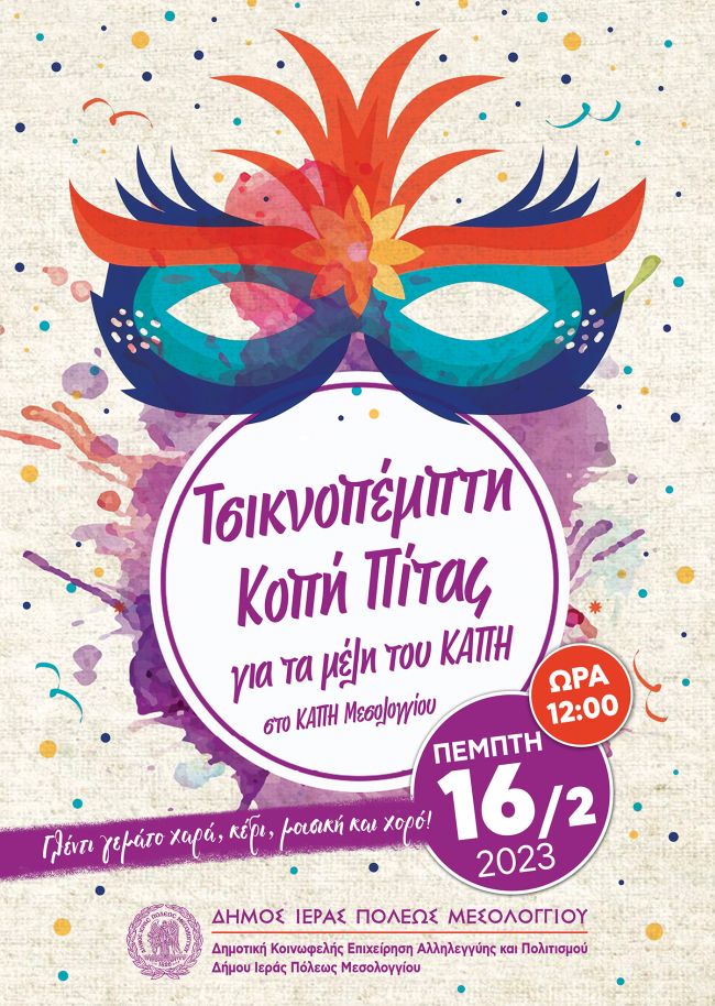 Γιορτή για τα μέλη του Κ.Α.Π.Η. του Δήμου Ι.Π. Μεσολογγίου θα πραγματοποιηθεί την Τσικνοπέμπτη και ακολούθως θα γίνει η κοπή της πρωτοχρονιάτικης πίτας.