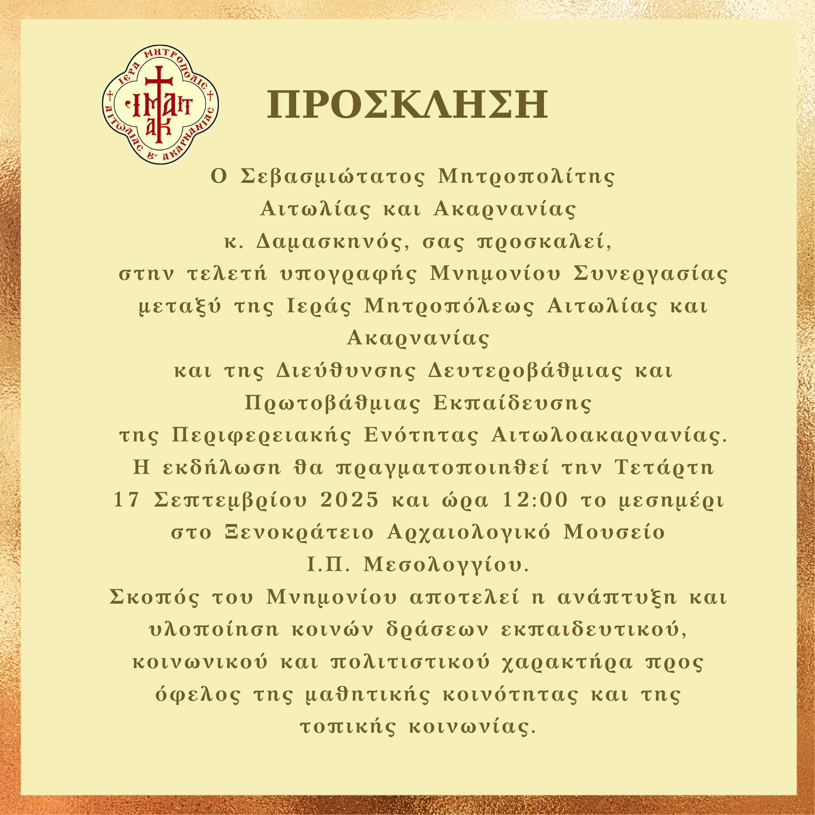 Η υπογραφή του μνημονίου θα πραγματοποιηθεί την Τετάρτη, 17 Σεπτεμβρίου 2025, στις 12:00 το μεσημέρι, στο Ξενοκράτειο Αρχαιολογικό Μουσείο Ι.Π. Μεσολογγίου και αποτελεί μια ιδιαίτερα σημαντική στιγμή για τον εκπαιδευτικό και πολιτιστικό ιστό της περιοχής καθώς και για την Τοπική μας Εκκλησία.