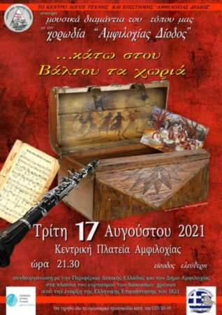 Το Κέντρο Λόγου, Τέχνης και Επιστήμης «Αμφιλοχίας Δίοδος», η Περιφέρεια Δυτικής Ελλάδας και ο Δήμος Αμφιλοχίας σας προσκαλούν στην μουσική εκδήλωση «Κάτω στου Βάλτου τα χωριά», αύριο Τρίτη 17 Αυγούστου 2021 στις 21:30 στην κεντρική πλατεία Αμφιλοχίας.