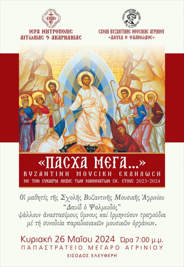 Η Ιερά Μητρόπολις Αιτωλίας και Ακαρνανίας, προαναγγέλλει την πραγματοποίηση Μουσικής Εκδήλωσης με την ευκαιρία της λήξης των μαθημάτων σχ. έτους 2023-24, από τη Σχολή Βυζαντινής Μουσικής Αγρινίου «Δαυίδ ο Ψαλμωδός».